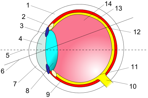 8 – soczewka, 9 – naczyniówka, 10 – nerw wzrokowy, 11 – plamka ślepa, 12 – dołek środkowy (plamka żółta), 13 – siatkówka, 14 – ciało szkliste,